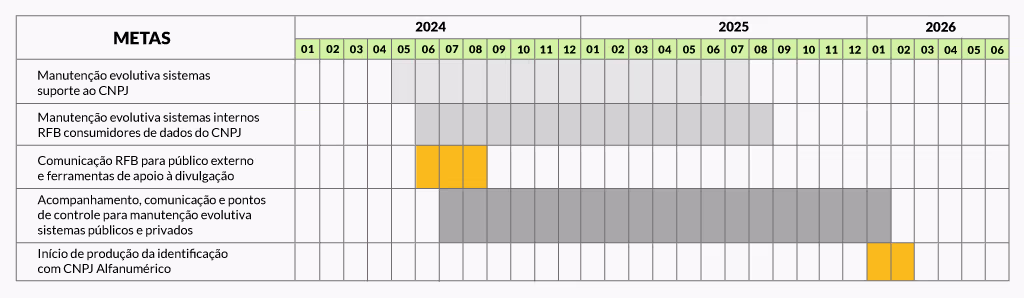 De acordo com a Nota Técnica, o desenvolvimento do Projeto CNPJ Alfanumérico já está em andamento e a Receita Federal prevê a implementação completa do novo número de identificação para janeiro de 2026, com o seguinte cronograma: