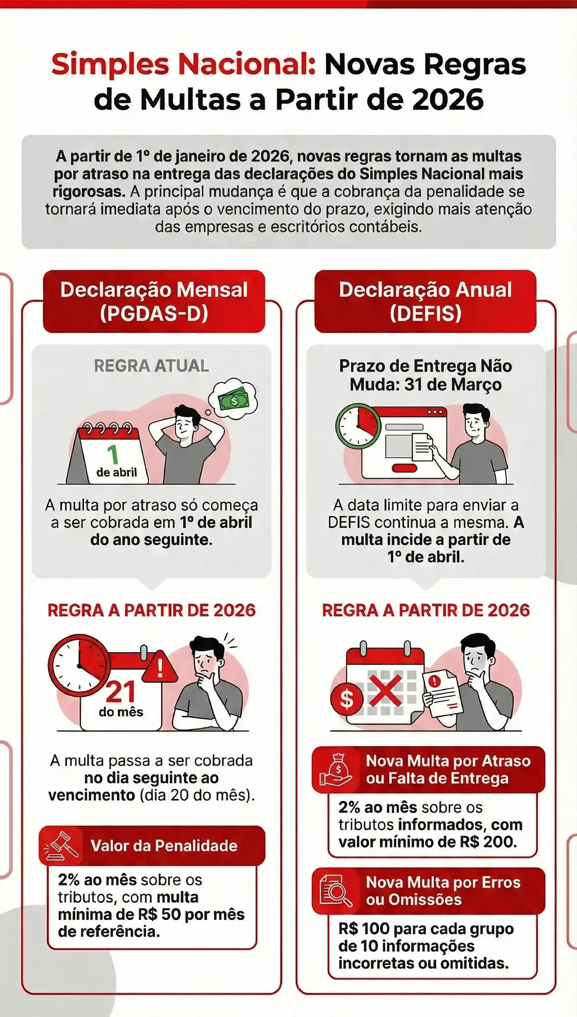 Outra novidade relevante do Simples Nacional em 2026 são as penalidades específicas para a DEFIS. A Resolução CGSN nº 183/2025 regulamenta os valores previstos no art. 38, § 3º, da Lei Complementar nº 123/2006.